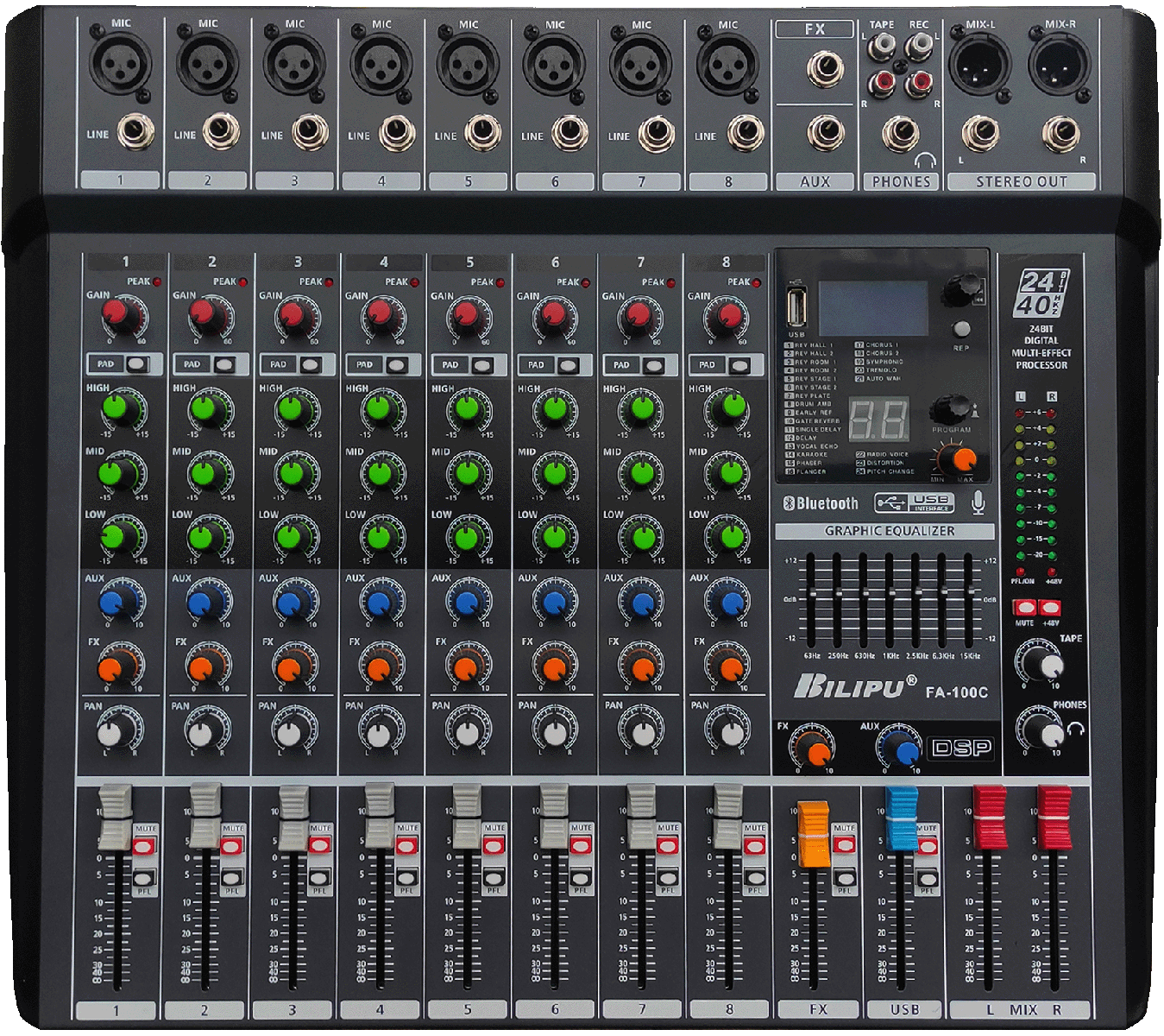 | FA-80C | 1、六路单声道输入、两路立体声输出,支持平衡MIC/非平衡LINE接口;两路AUX辅助(含FX效果器); 2、输入通道具有高中低音调节;、立体声输出具有7段2/3倍频程均衡调节; 3、USB接口可接U盘MP3歌曲播放,显示歌曲播放内容,支持蓝牙链接歌曲播放功能; 4、数码显示效果器;+48V幻像电源;输入灵敏度选择;输入峰值LED指示; 5、频率响应:20Hz-20KHz±3dB 6、总谐波失真:<0.05% 7、信噪比:<-90dB 8、输出增益:+12dB 9、通道串扰:>96dB