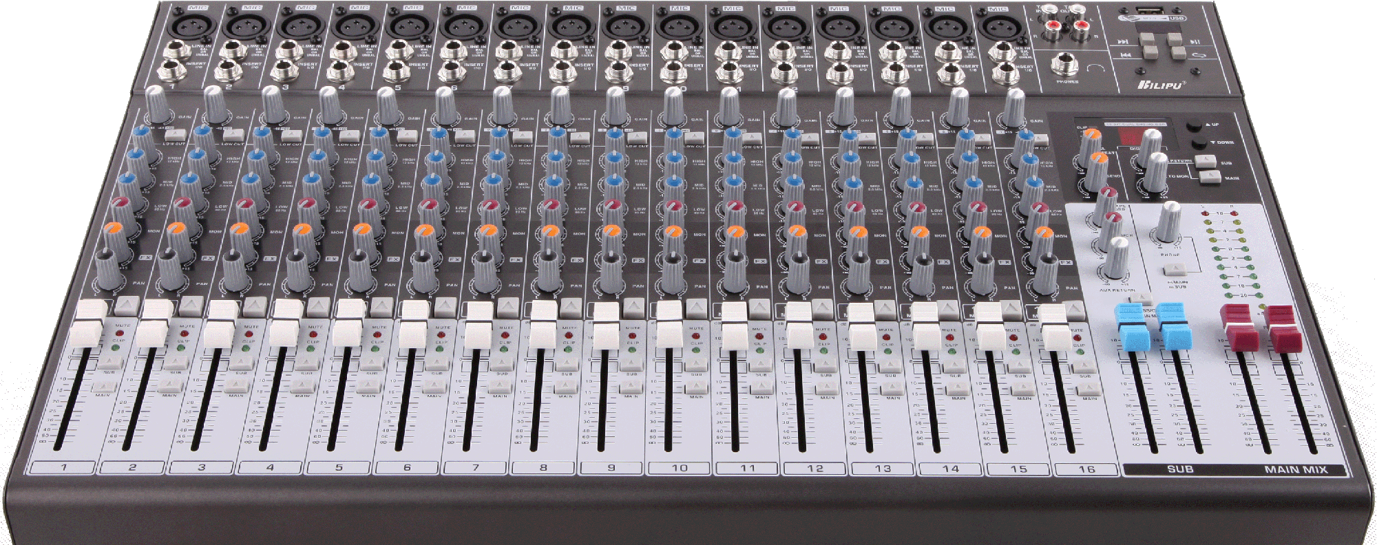 1、十六路单声道输入;立体声、两编组输出;两路AUX辅助(含FX效果器);