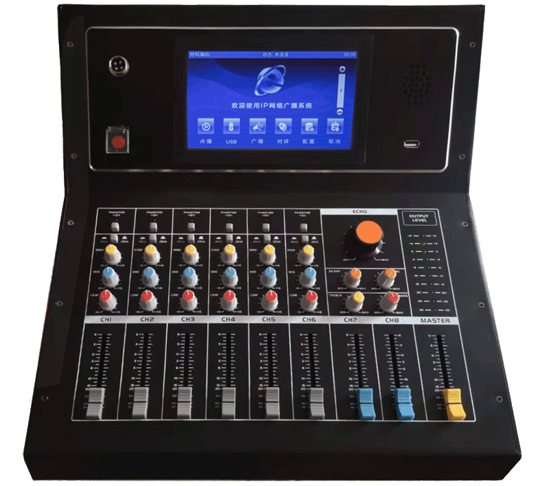 1、独特的上柜式安装设计,自带7英寸电容触摸屏控制;8路IP网络调音台;