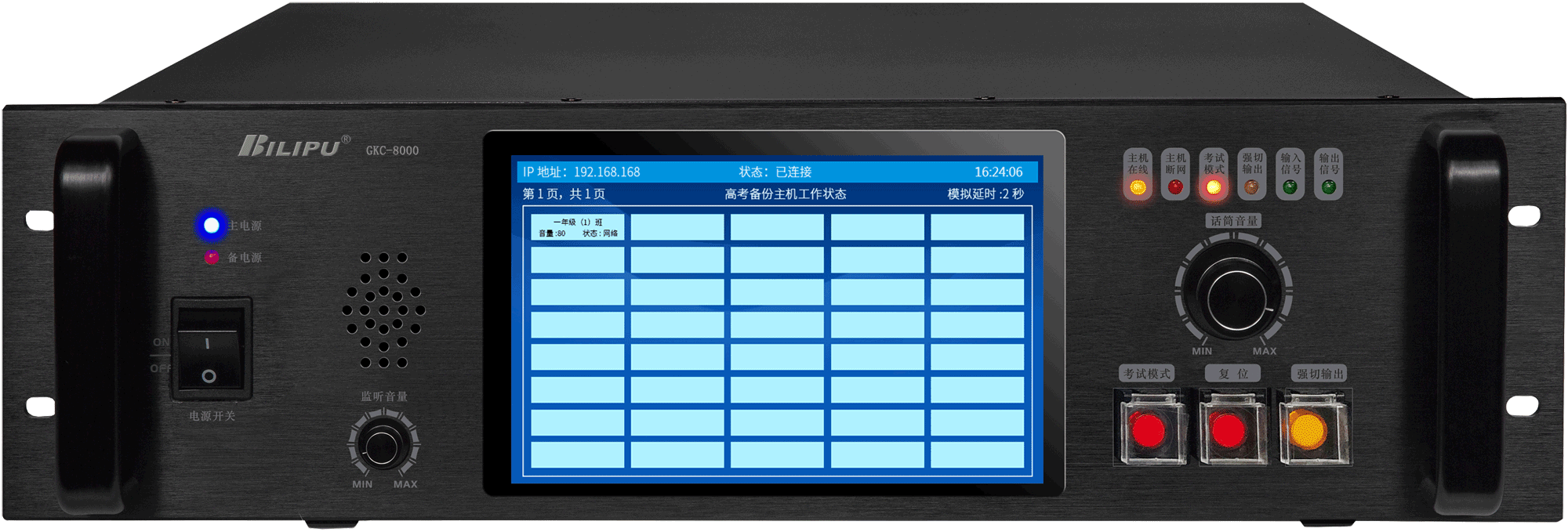 7、主机设有一键开启考试模式,当启动此键时,所设置为保障终端都被接管起来,并在本机显示屏上显示出被管终端的名称、音量及工作状态。